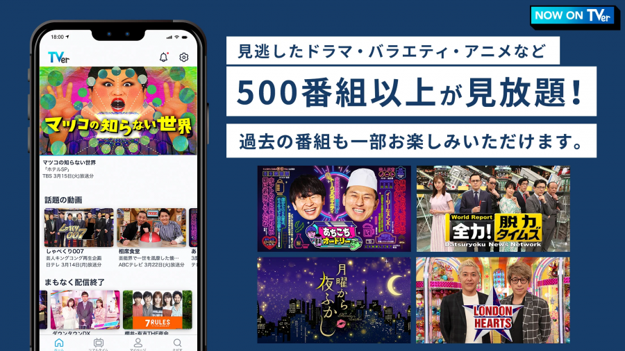 「TVer」は民放各社が共同出資した完全無料の動画配信サービスです。人気のテレビ番組が放送後1週間、0円で見逃し配信されています。追加課金はありません。自分の住んでいる地域では放送されていない番組も観られます。