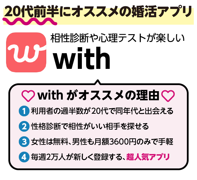 ですが、withは20代が多数派かつ、真面目な恋愛がテーマのため、婚活でも恋活でも使えるアプリです。価値観や性格など内面を重視してマッチングする機能があり、将来を見据えた出会いに向いています。