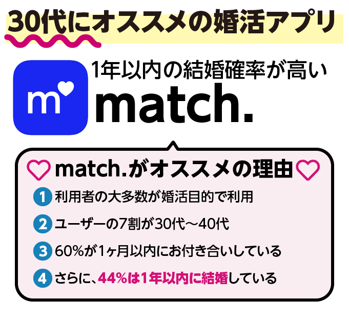 30代が多く、真剣婚活にしたい人におすすめなのがmatch(マッチ・ドットコム)です。