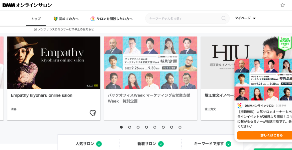 DMMオンラインサロンは非常に大きなオンラインサロンのひとつで、アイドルやアーティスト、ビジネスまで幅広いオンラインサロンがあり、多くの有名人・著名人も利用しています。