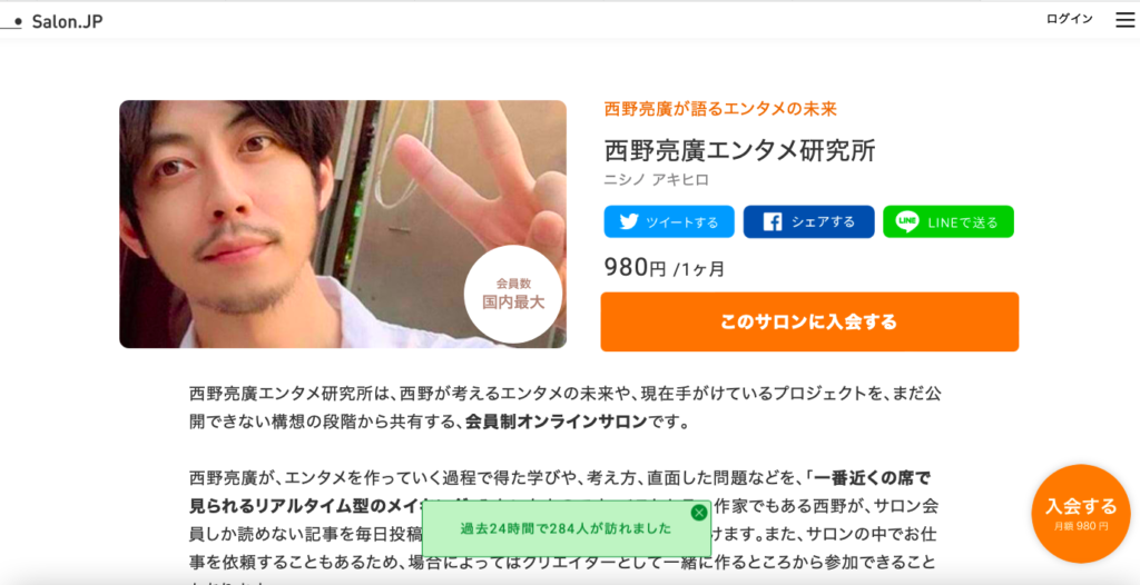 Salon.jpは、日本で非常に有名なオンラインサロン「西野亮廣エンタメ研究所」を運営している西野亮廣さんが運営するオンラインサロンサービスです。