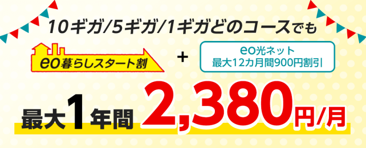 2023年11月最新のeo光の公式キャンペーンは月額料金が最大1年間2,380円で利用できるeo暮らしスタート割がおすすめ!さらに、2023年11月1日〜2024年1月31日の期間限定で5,000円分の商品券も利用できます。eo光は代理店からも申し込み可能ですが、公式サイトのキャンペーンが1番お得でおすすめです。