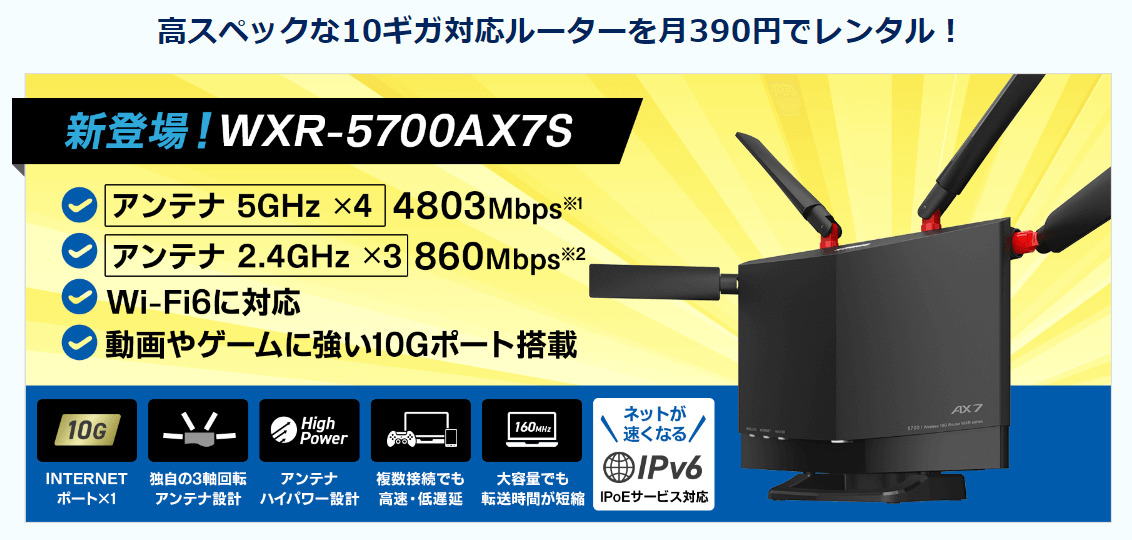 大手プロバイダGMOとくとくBBが提供する光回線サービス・GMOとくとくBB光は最大速度10Gbpsの高速プランを提供中で、10ギガ対応Wi-Fiルーター通常月額390円でレンタル可能!